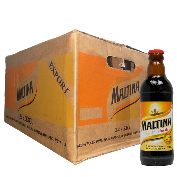 Each crate contains 24 bottles of 33cl Maltina, perfect for family gatherings, parties, or stocking up your home supply.